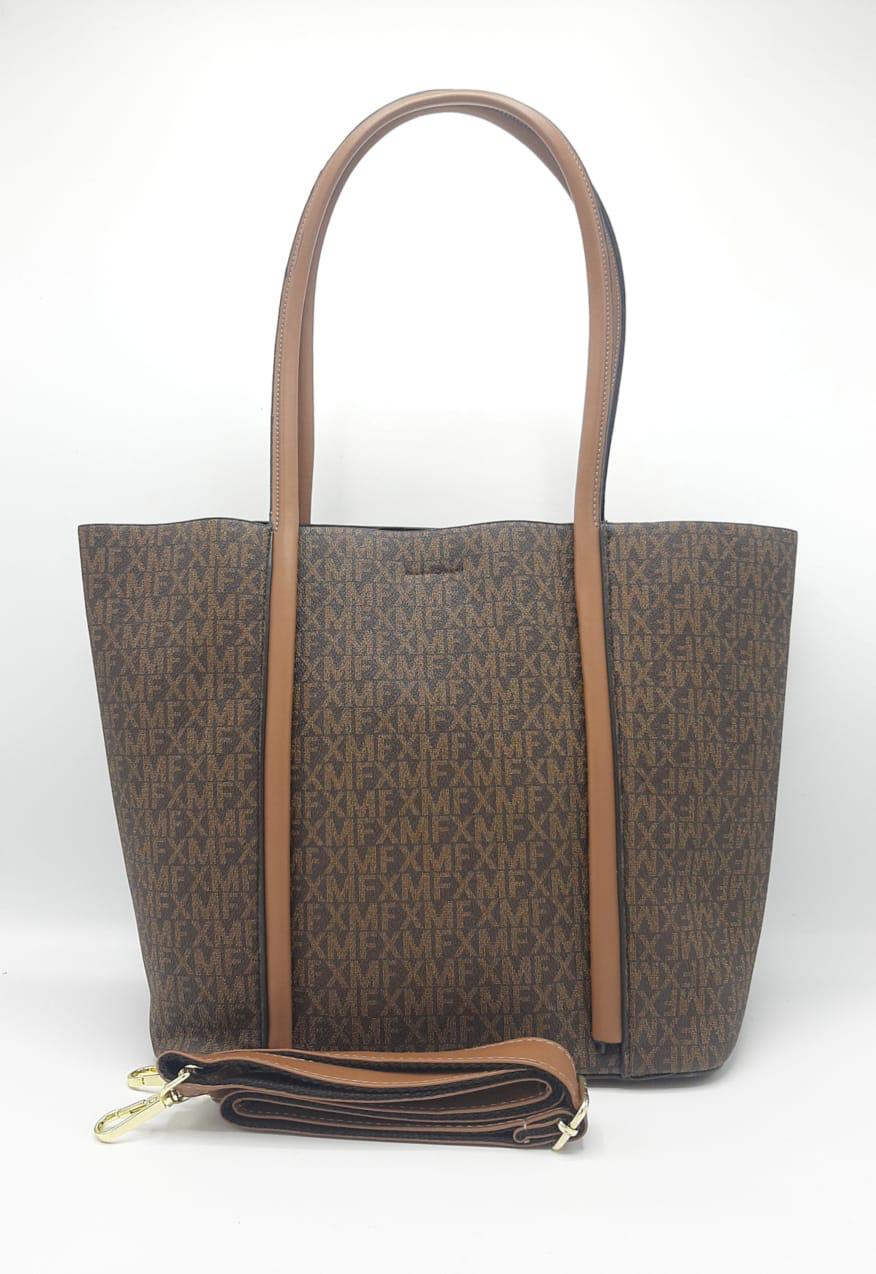 This is a fashionable monogram tote designed for those who love bold branding and structured style. The dual vertical brown straps give it a sleek, tall silhouette. Ideal for shopping, work, or casual outings, this tote blends utility with upscale appeal.